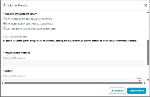 Ao ativar a opção Pauta bloqueada, a pauta é criada bloqueada para votação.